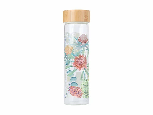 This glass water bottle from the Native Blooms collection captures the beauty of Australian flora. Designed in collaboration with Royal Botanic Gardens Victoria, it features a design based on original illustrations of our beloved native flowers. With a contemporary cylindrical shape and 550ml capacity, itβs a pretty everyday water bottle and a great option for picnics. Made from quality borosilicate glass, itβs sturdy as well as stylish.
